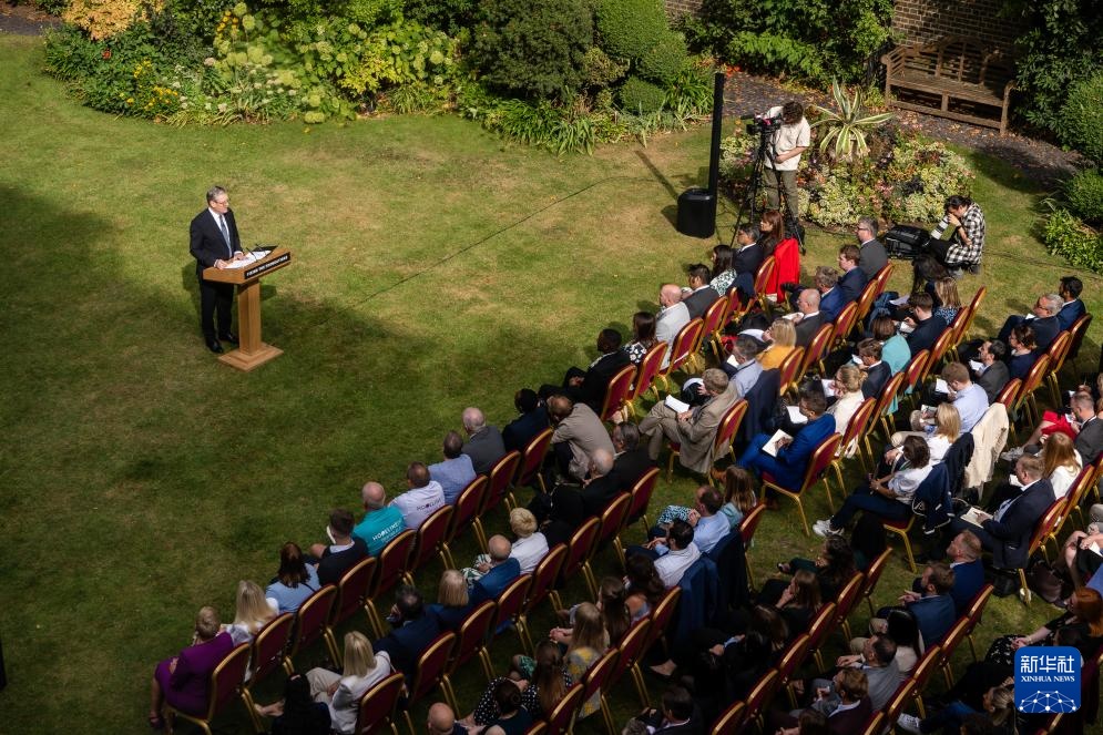 8月27日,英国首相斯塔默在伦敦唐宁街花园发表讲话。