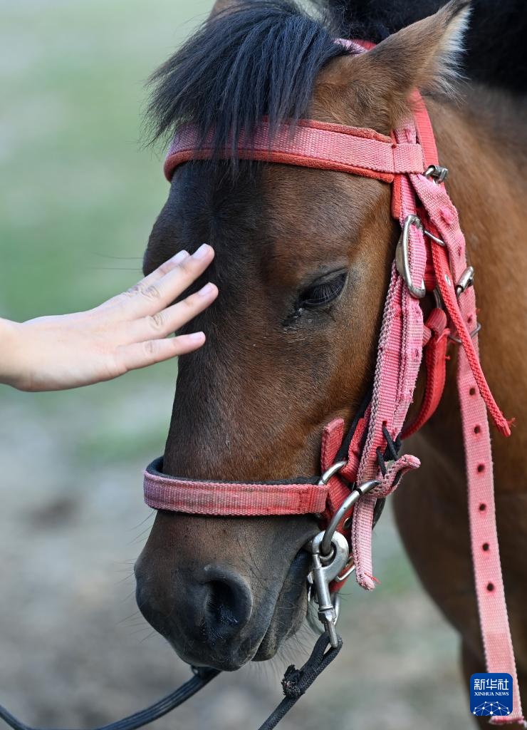 8月27日,游客在广西德保矮马王国与德保矮马互动。