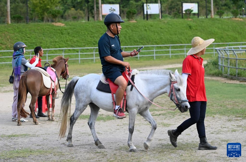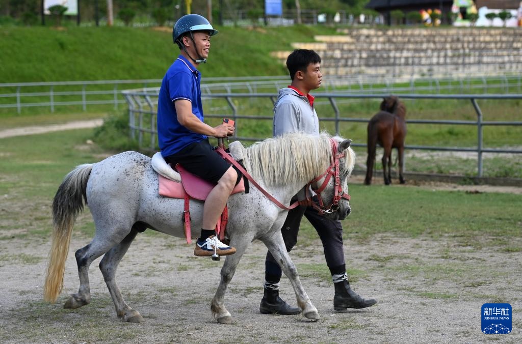 8月27日,游客在广西德保矮马王国骑德保矮马游玩。