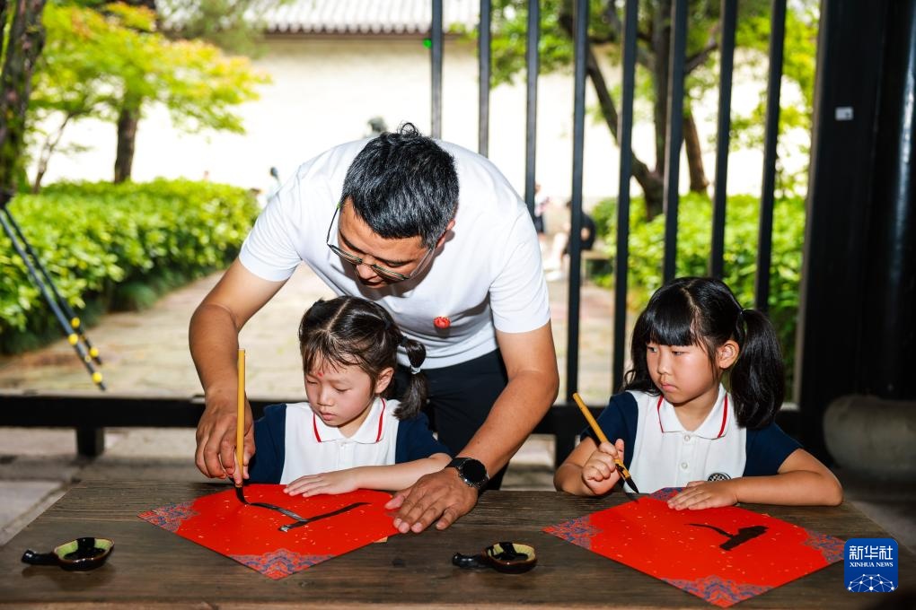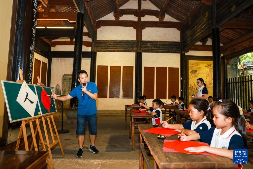 8月28日,宁波市中城小学的教师带领参加开学礼的一年级新生用毛笔书写“人”字。