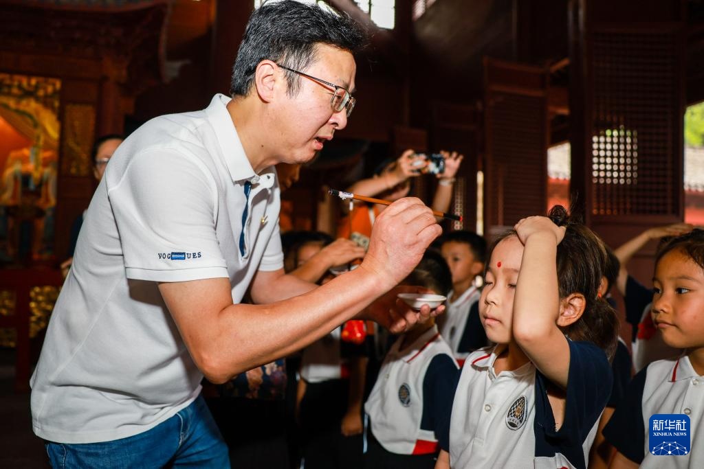 8月28日,宁波市中城小学的教师为参加开学礼的一年级新生点朱砂。
