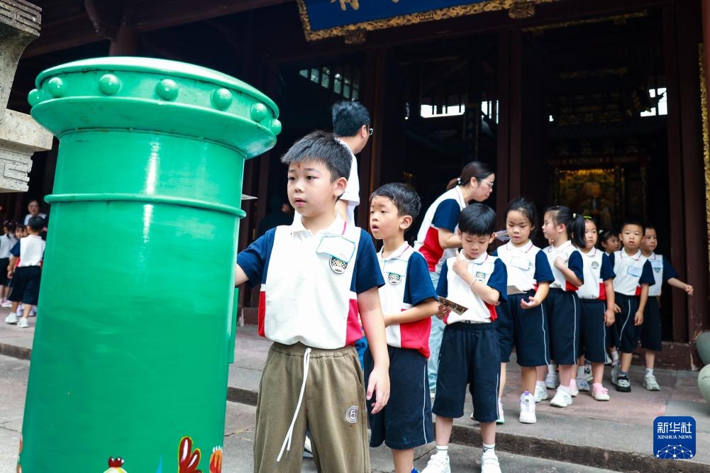 8月28日,宁波市中城小学一年级新生在开学礼结束后向邮筒内投入写有对自己未来期望的明信片。
