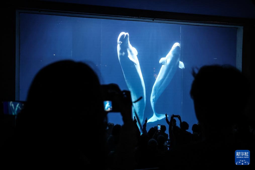 游客在大连圣亚海洋世界观赏白鲸(5月22日摄)。