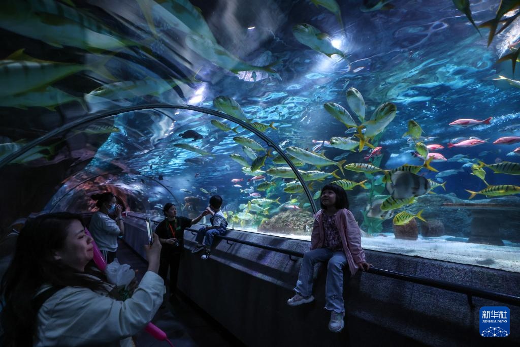 游客在大连圣亚海洋世界观赏海洋鱼类(5月22日摄)。