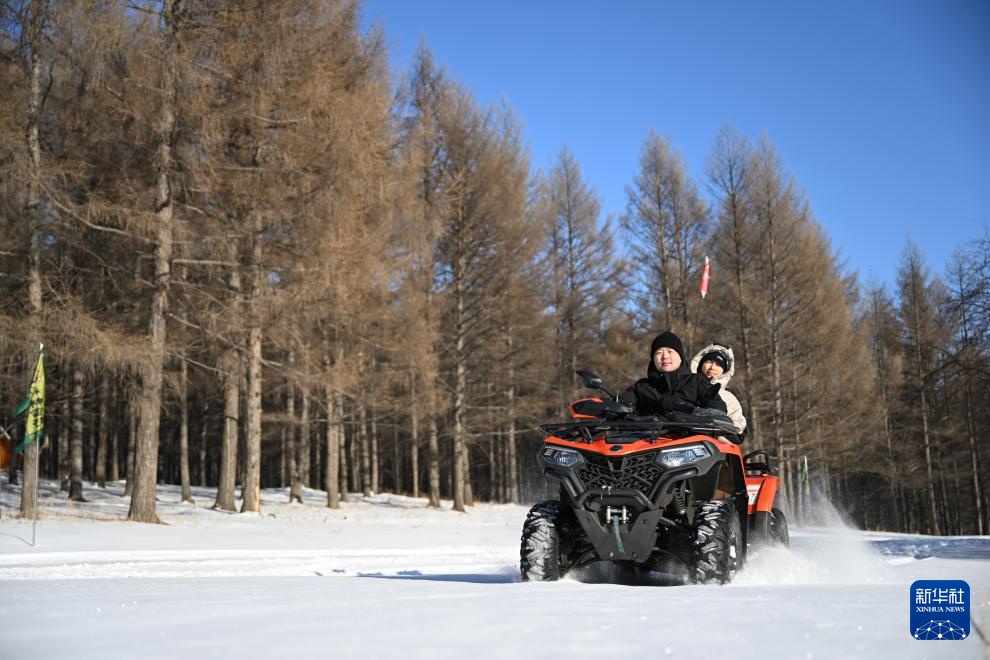 游客在内蒙古兴安盟阿尔山市驾驶雪地摩托游玩(2023年12月14日摄)。