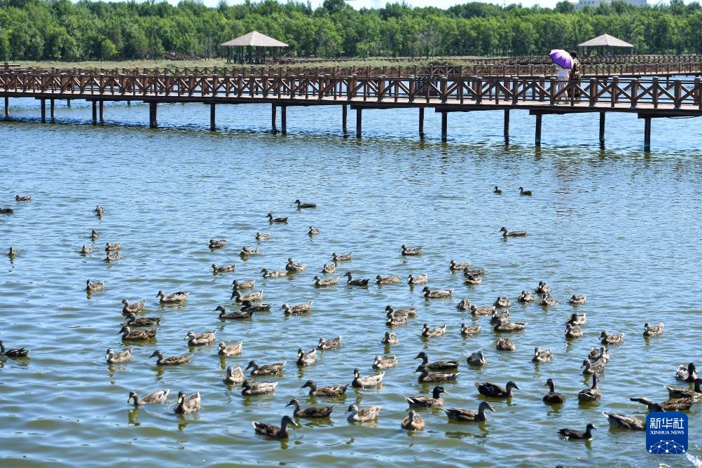 8月26日,游客在吉林省松原市查干湖野鸭岛游览。