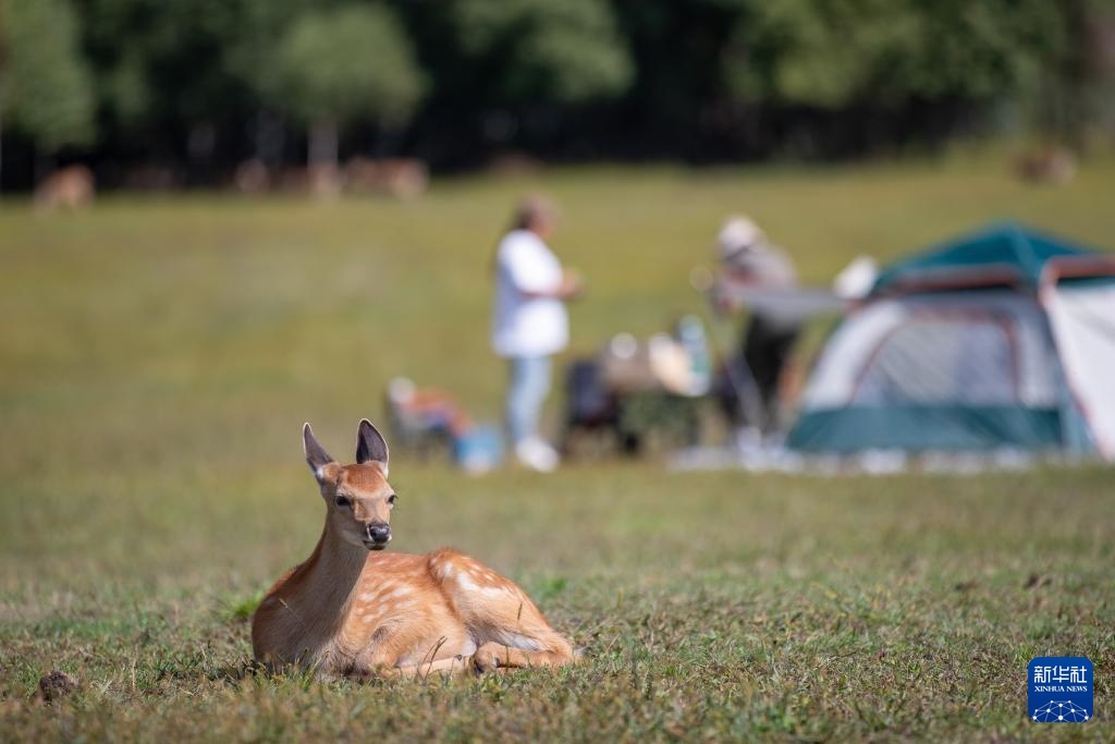 8月27日,在黑龙江伊春市上甘岭溪水国家森林公园鹿溪牧场,一只鹿在草坪上休息。