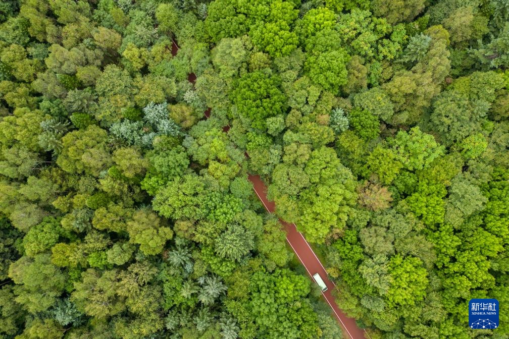 8月27日,游客乘坐电瓶车在黑龙江伊春市上甘岭溪水国家森林公园内穿行(无人机照片)。