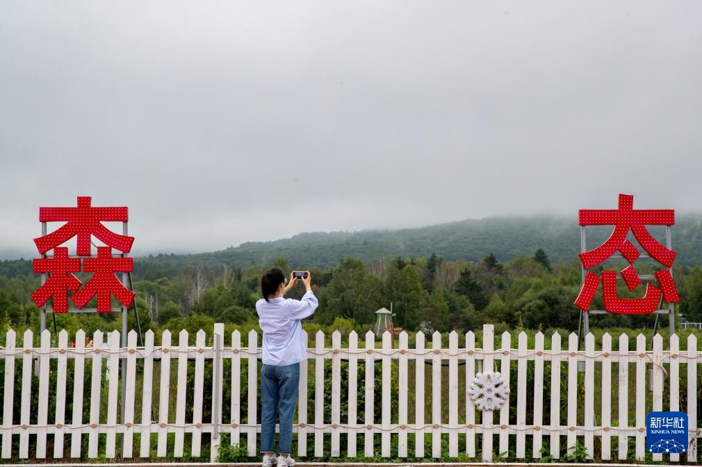 8月27日,一名游客在黑龙江伊春森工集团上甘岭林业局公司溪水林场拍照。