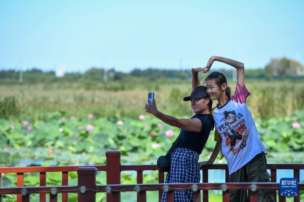 8月26日,游客在吉林省松原市查干湖拍照留念。