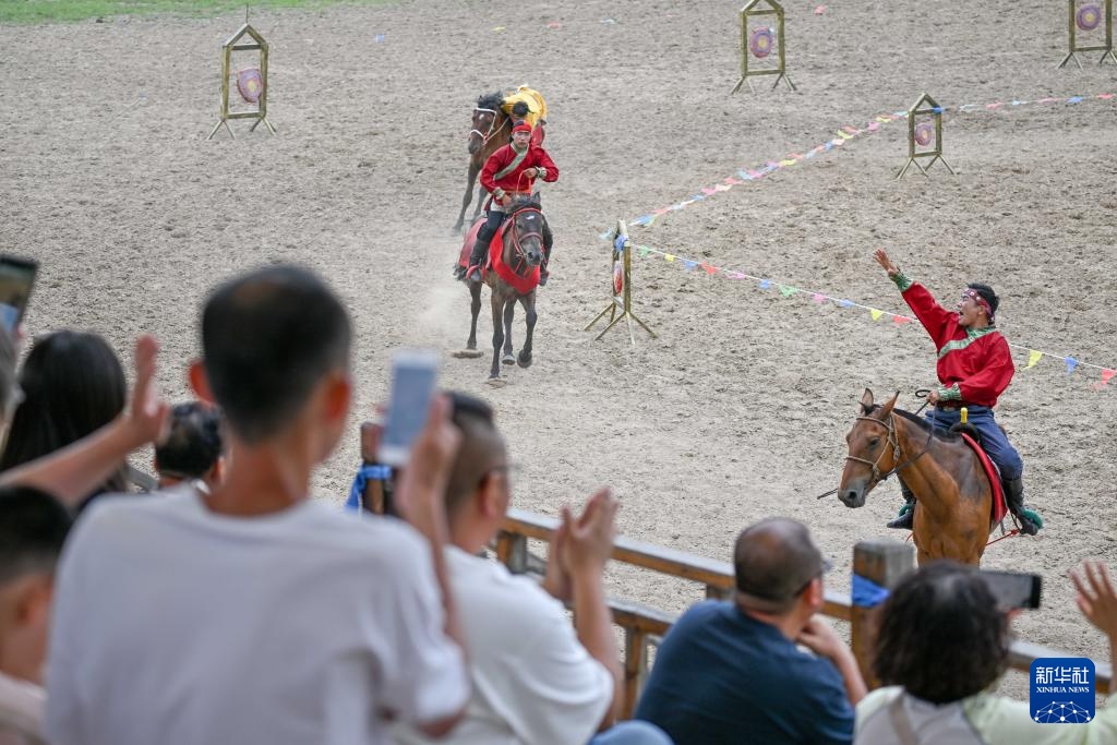 8月8日,游客在内蒙古兴安盟科尔沁右翼前旗乌兰毛都草原观看马术实景剧。