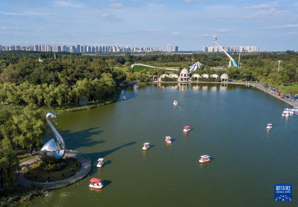 8月20日,游客在黑龙江哈尔滨太阳岛风景区太阳湖上乘船游览(无人机照片)。