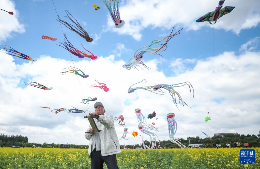 在辽宁省康平县,一名风筝爱好者在风筝节活动现场放风筝(5月31日摄)。