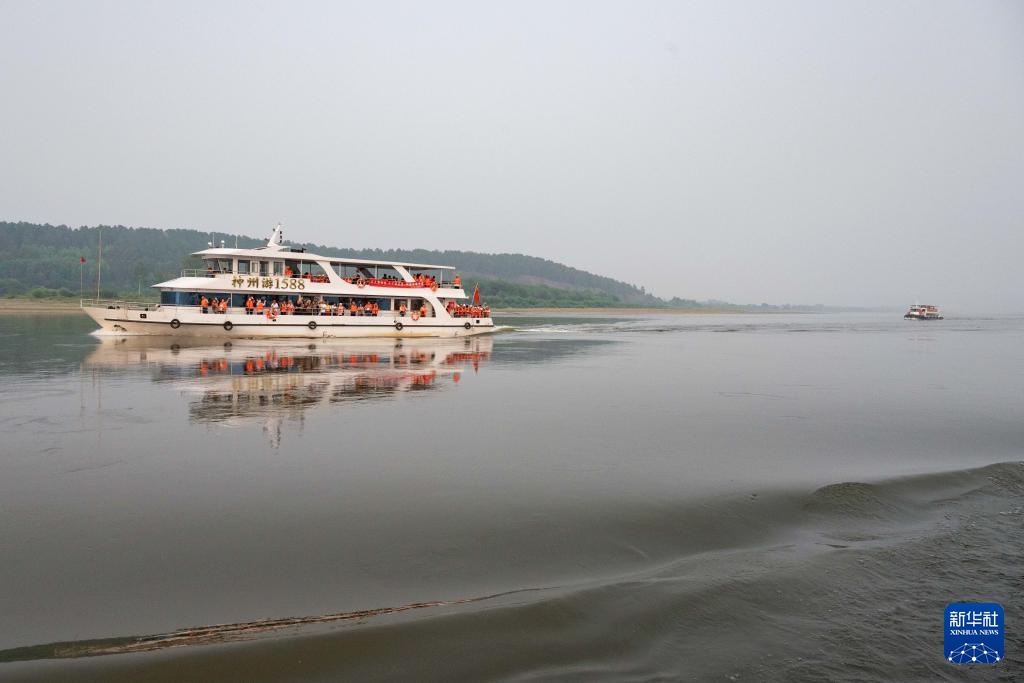 游客从黑龙江省漠河市北极村景区上船,乘船在黑龙江上观光游玩(7月2日摄)。