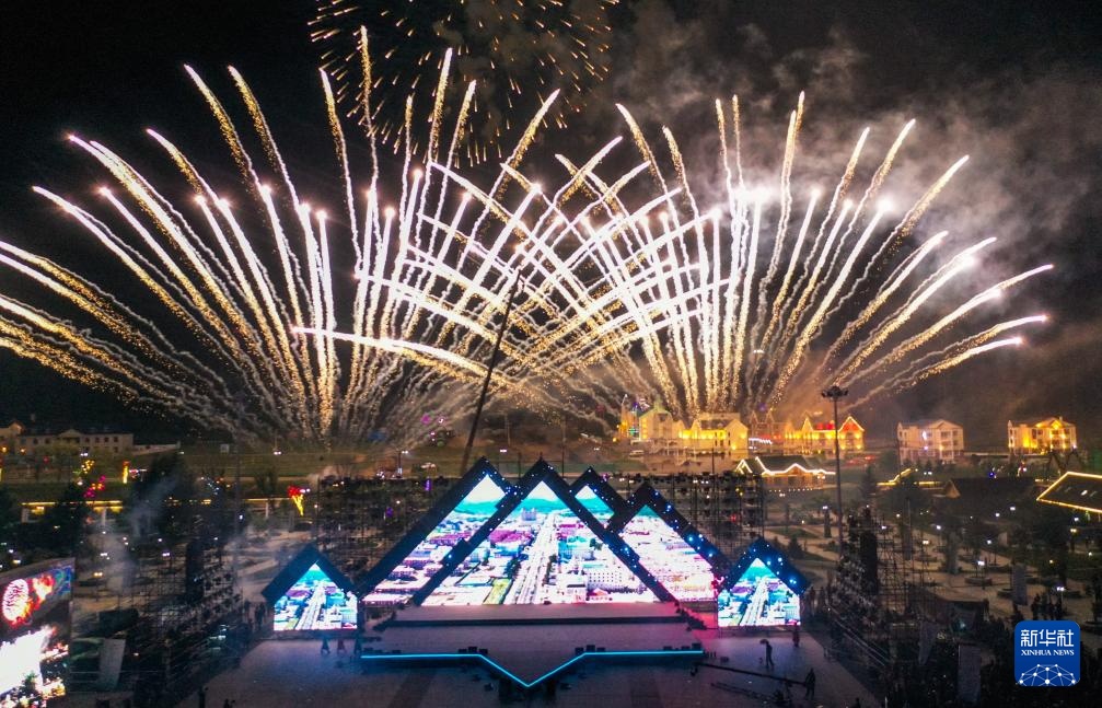 在内蒙古兴安盟阿尔山市拍摄的2023年中国(阿尔山)旅游大会开幕前一晚的焰火表演(2023年9月1日摄,无人机照片)。