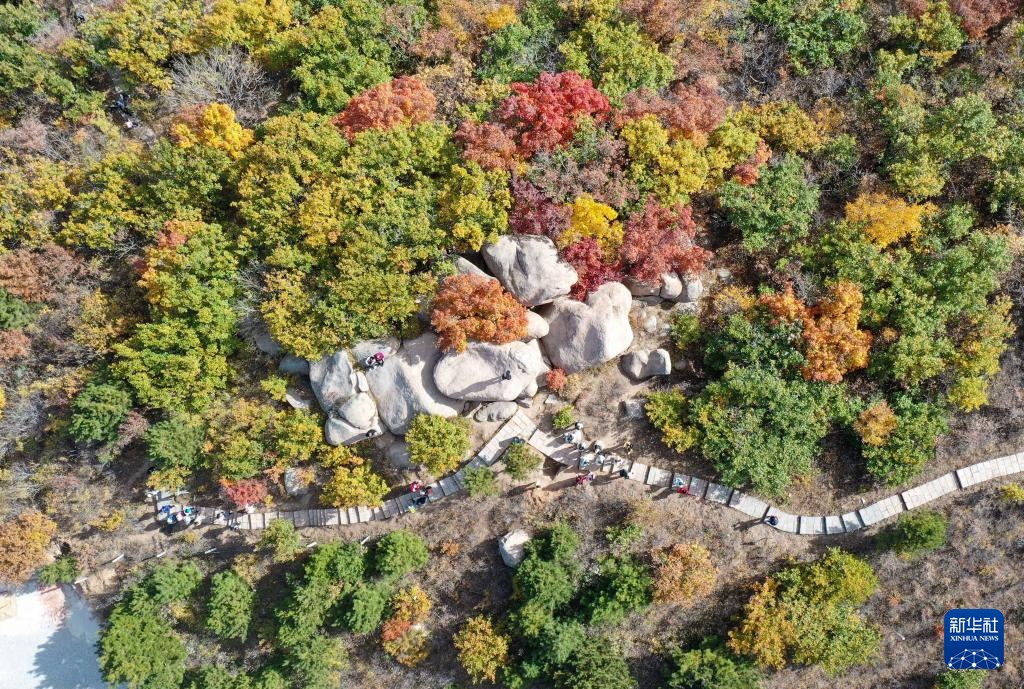 游客在辽宁阜新的海棠山游览(2023年10月19日摄,无人机照片)。