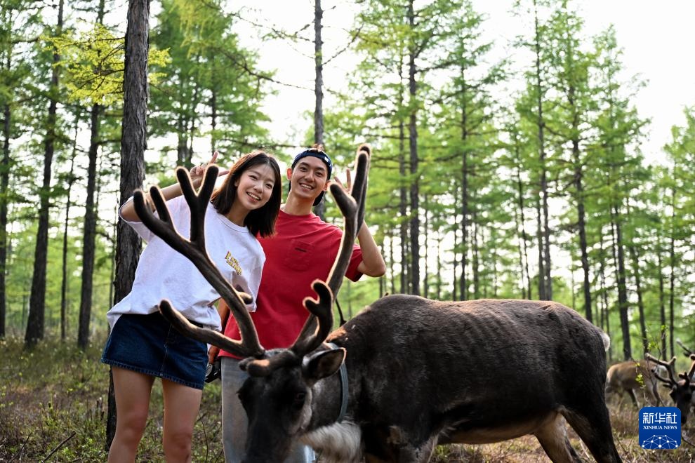 7月3日,游客在内蒙古呼伦贝尔市根河市阿尤莎驯鹿放养点游玩。
