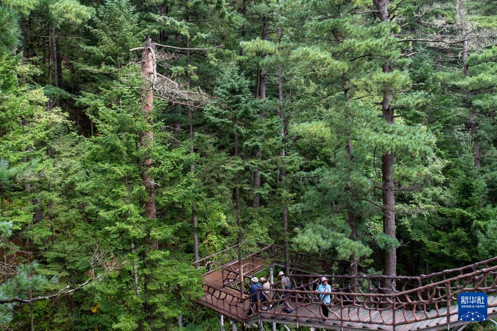 8月27日,游客在黑龙江伊春市上甘岭溪水国家森林公园内游览。