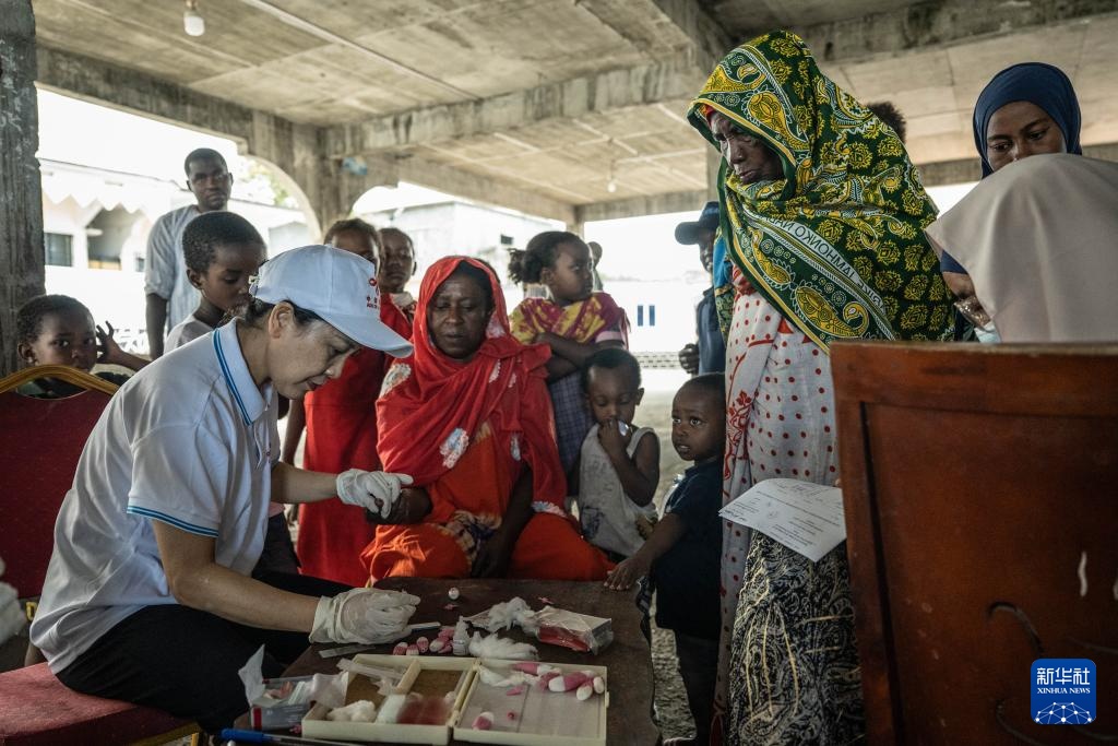 8月27日,中国抗疟团队组长陈银环(右二)在位于科摩罗首都莫罗尼北部的村庄内为村民采血化验。