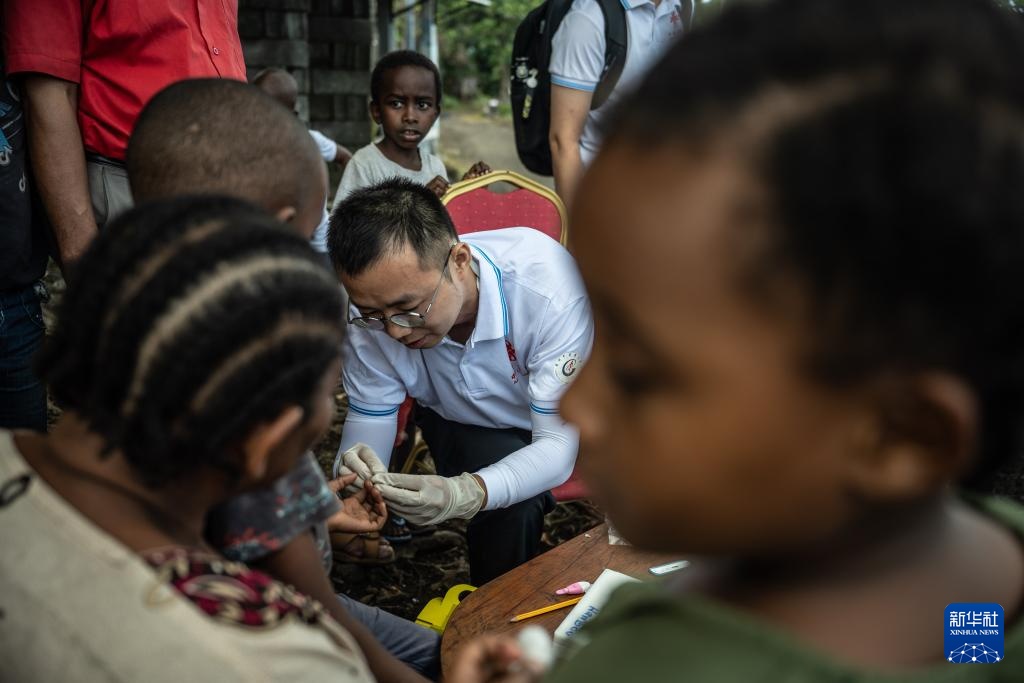 8月27日,中国抗疟团队组员周晟在位于科摩罗首都莫罗尼北部的村庄内为村民采血化验。