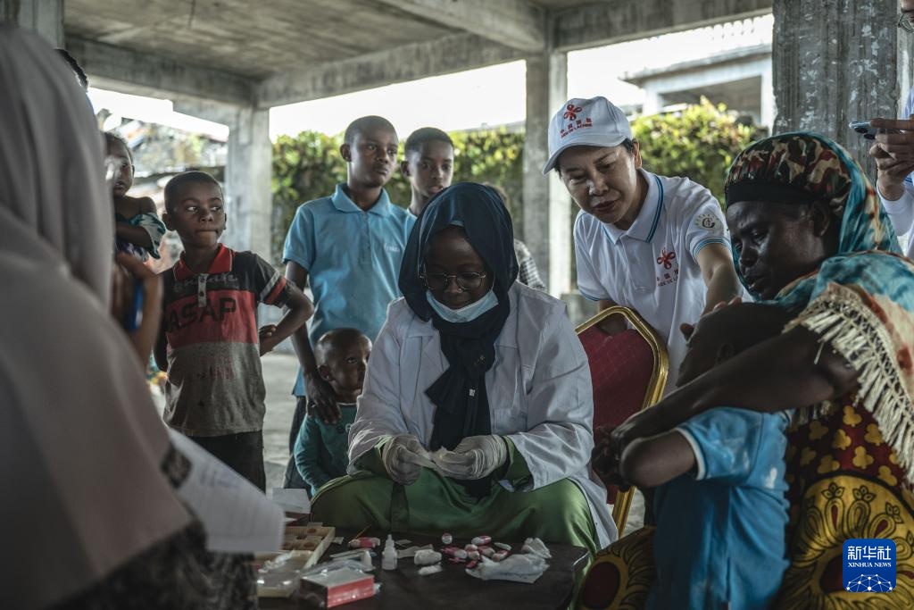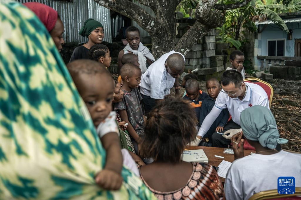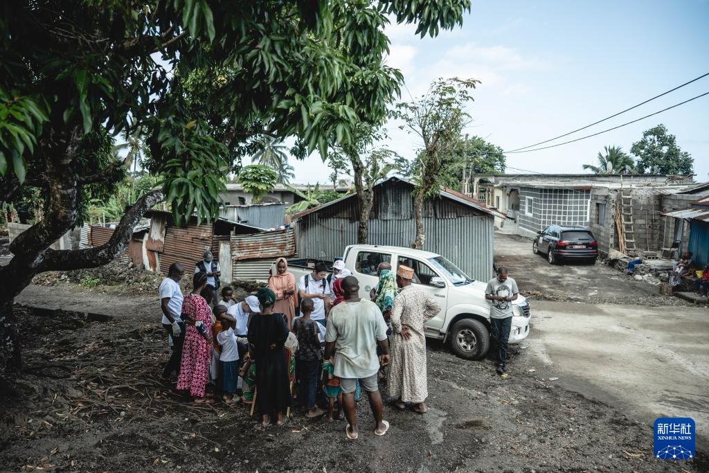 8月27日,中国抗疟团队在位于科摩罗首都莫罗尼北部的村庄内为村民采血化验。