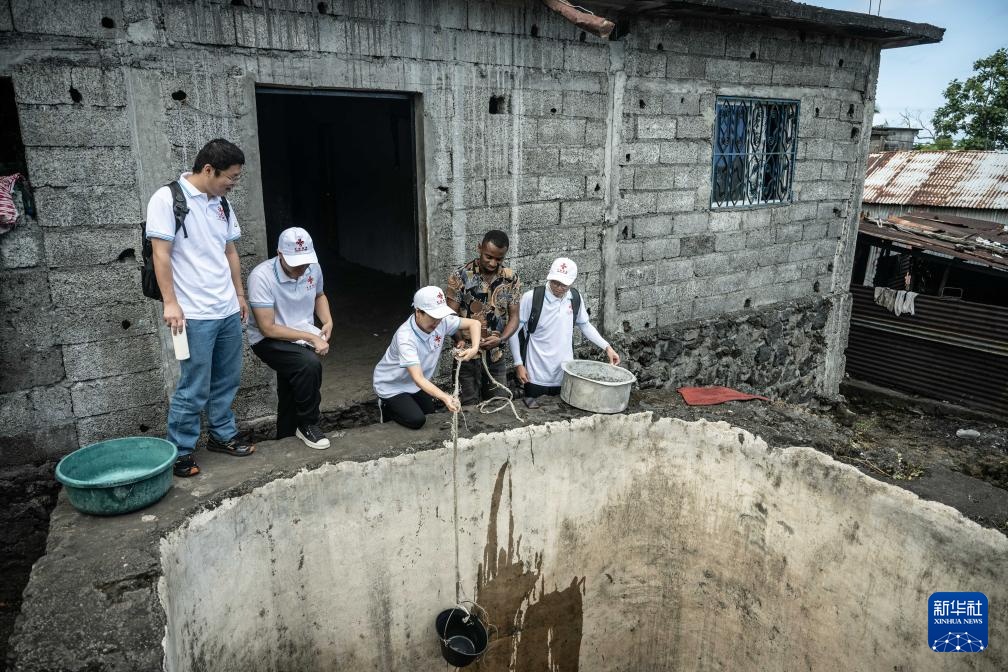 8月27日,中国抗疟团队在位于科摩罗首都莫罗尼北部的村庄内查看居民用水情况。