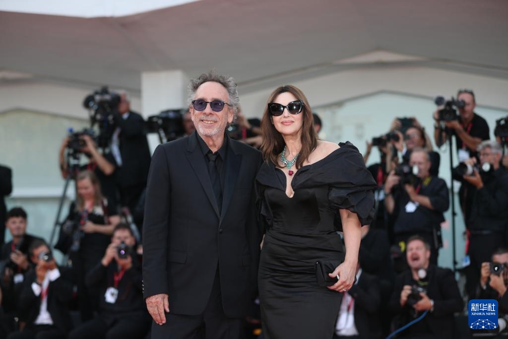 8月28日,在意大利威尼斯,影片《怪奇大法师》导演蒂姆·伯顿(左)与主演莫妮卡·贝鲁奇亮相红毯。