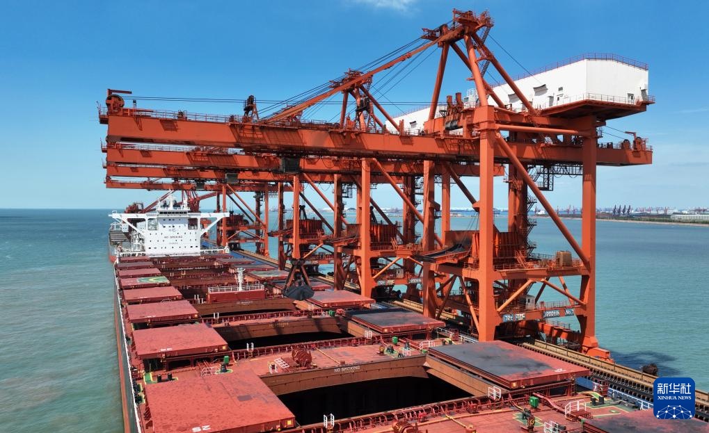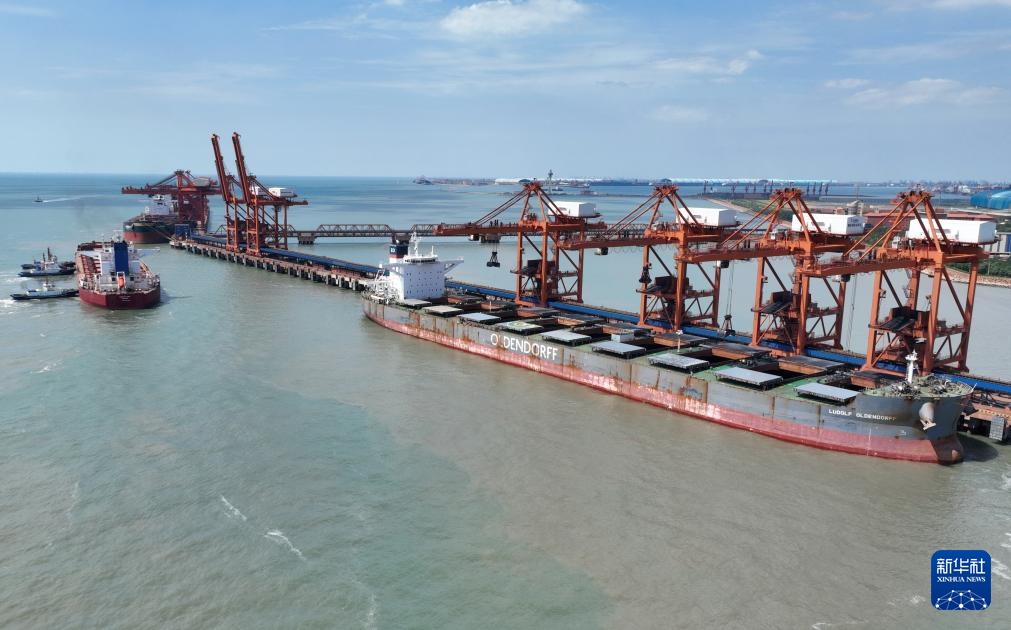 8月28日,一艘轮船靠泊在唐山港曹妃甸港区矿石码头卸载(无人机照片)。