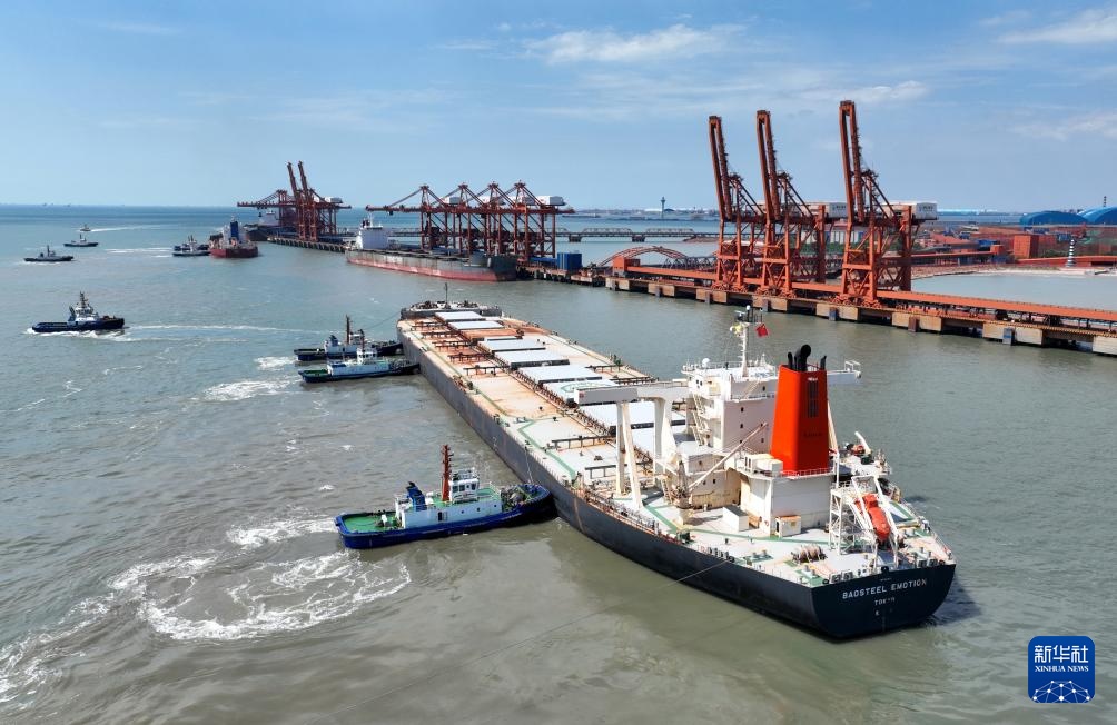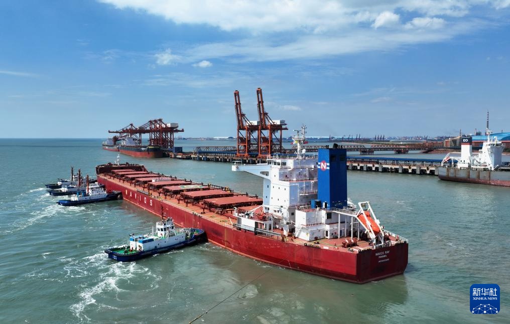 8月28日,一艘轮船在拖轮的协助下向唐山港曹妃甸港区矿石码头靠泊(无人机照片)。