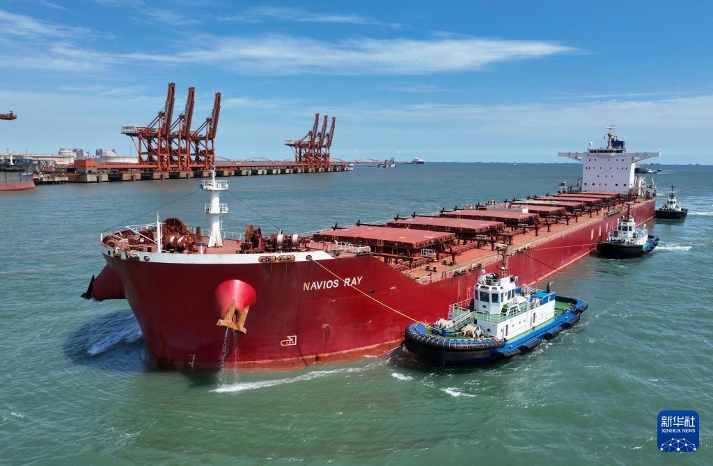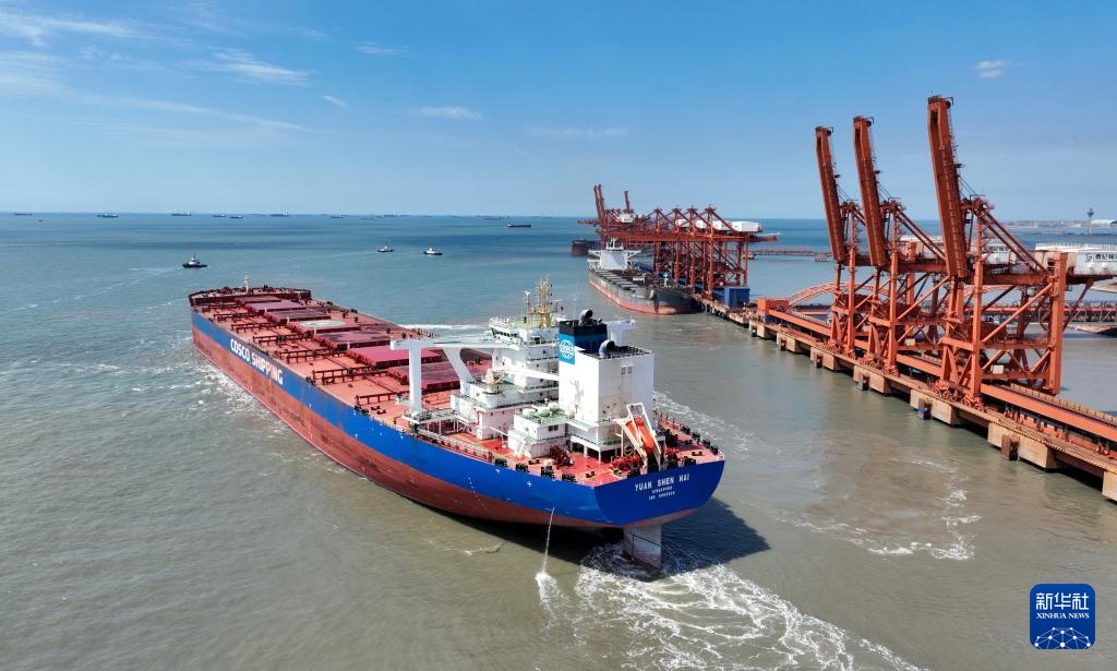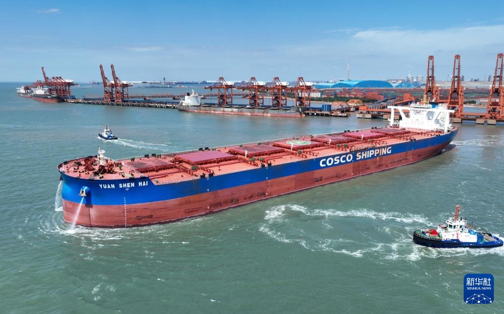 8月28日,一艘轮船在唐山港曹妃甸港区矿石码头卸载后驶离港区(无人机照片)。