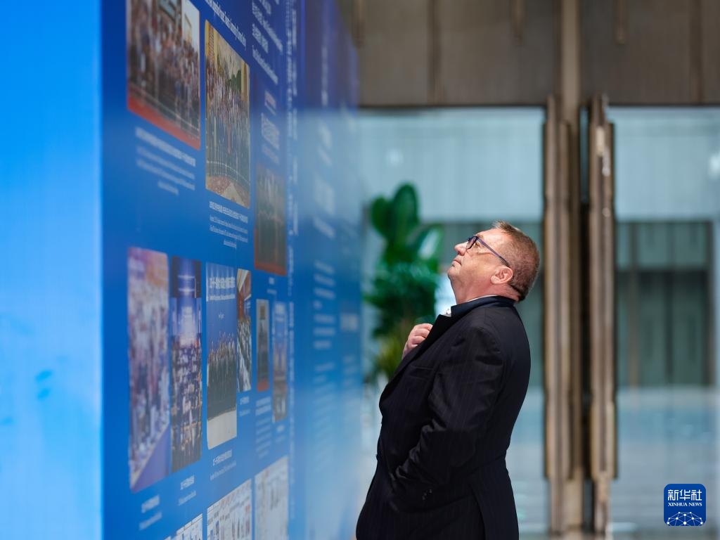 8月28日,参加2024“一带一路”媒体合作论坛的外国嘉宾在观看共建“一带一路”成果展示。