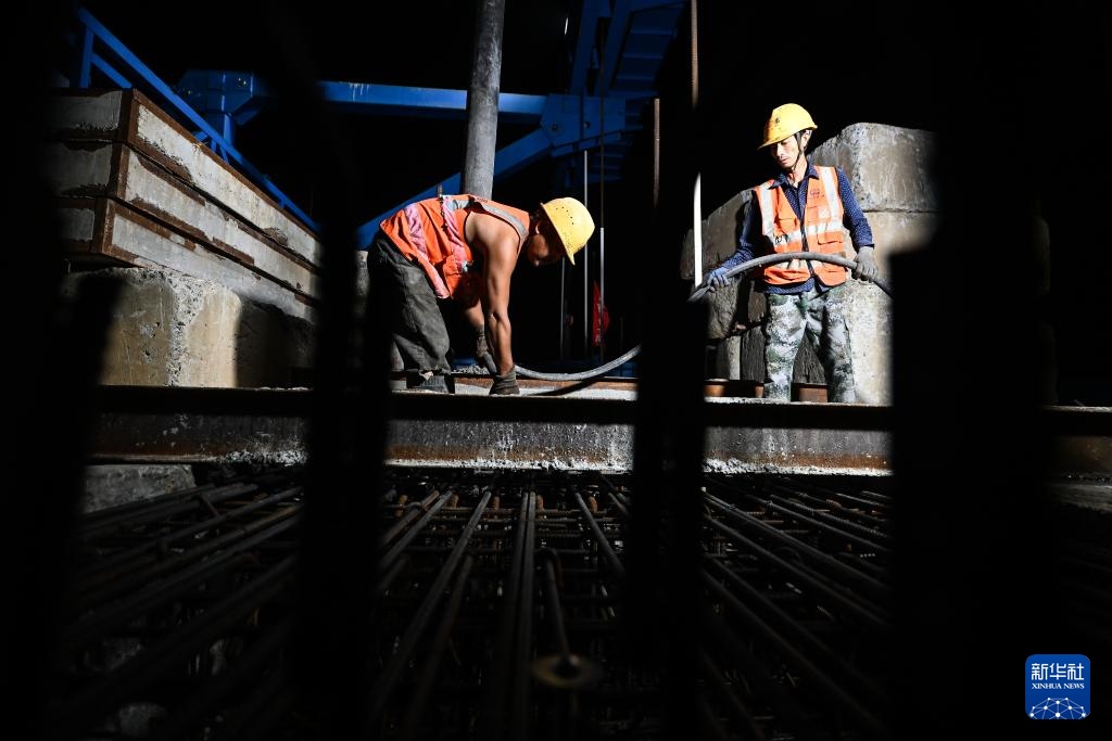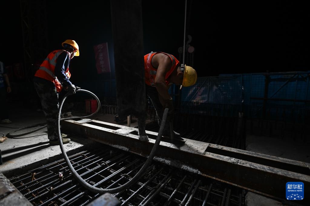 8月29日凌晨,工人在施工现场进行混凝土振捣作业。