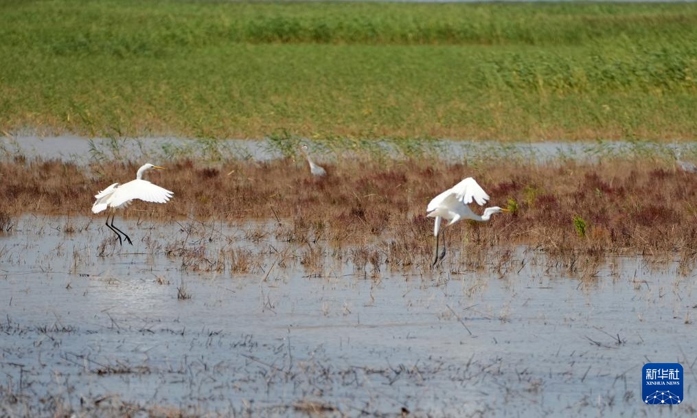 8月28日,鸟类在黄河三角洲国家级自然保护区湿地栖息。