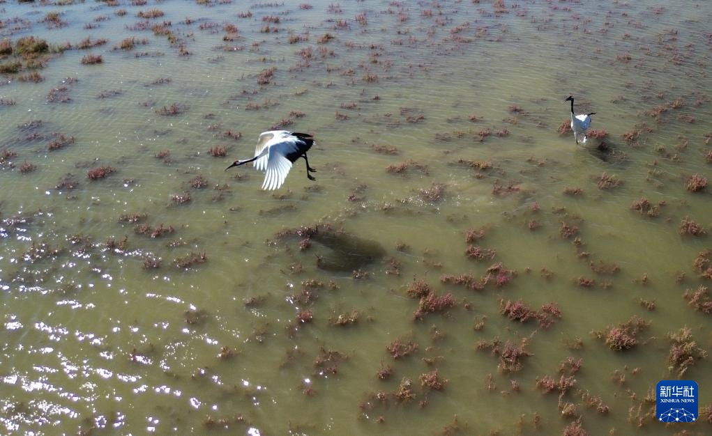 8月28日,丹顶鹤在黄河三角洲国家级自然保护区展翅翱翔(无人机照片)。