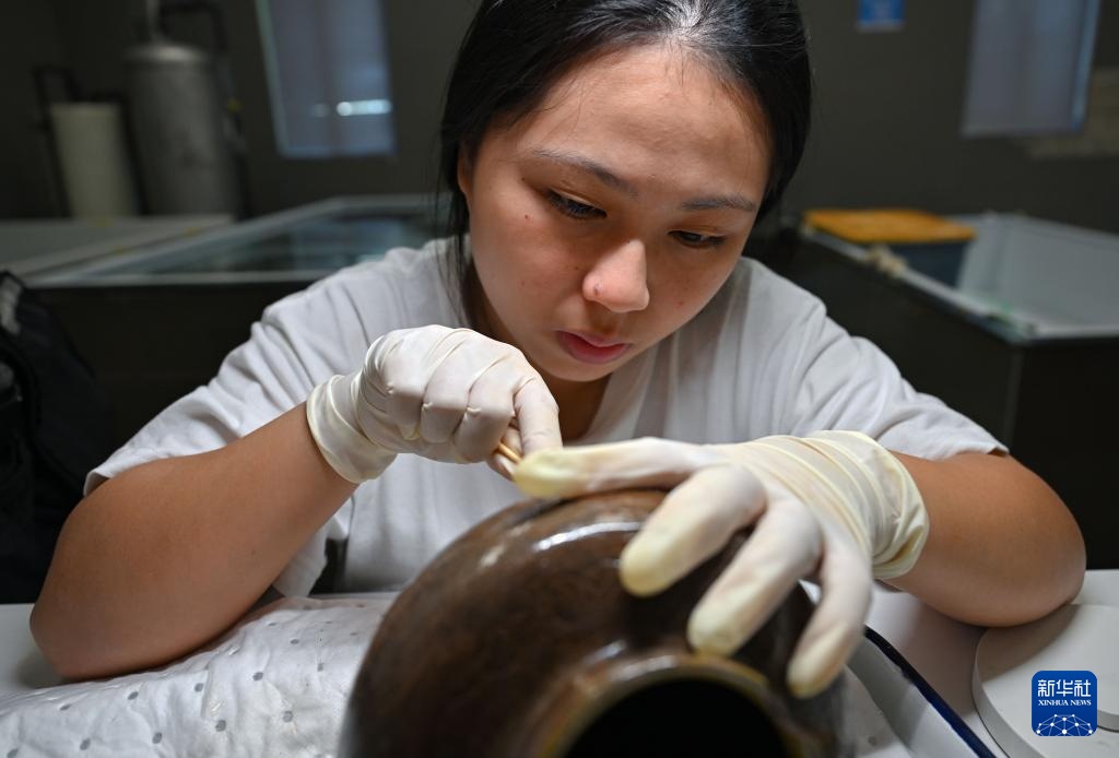 8月27日,中国(海南)南海博物馆的工作人员颜建超在修复文物。