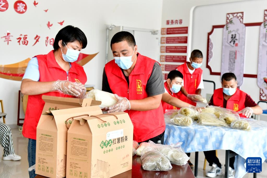 8月29日,在山东省滨州市惠民县胡集镇“如康家园”,工作人员和残疾人一起将粉条装箱。