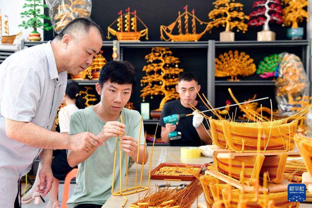 8月28日,在山东省滨州市惠民县辛店镇“如康家园”,工作人员张宗军(左一)在指导残疾人加工铝丝工艺品。