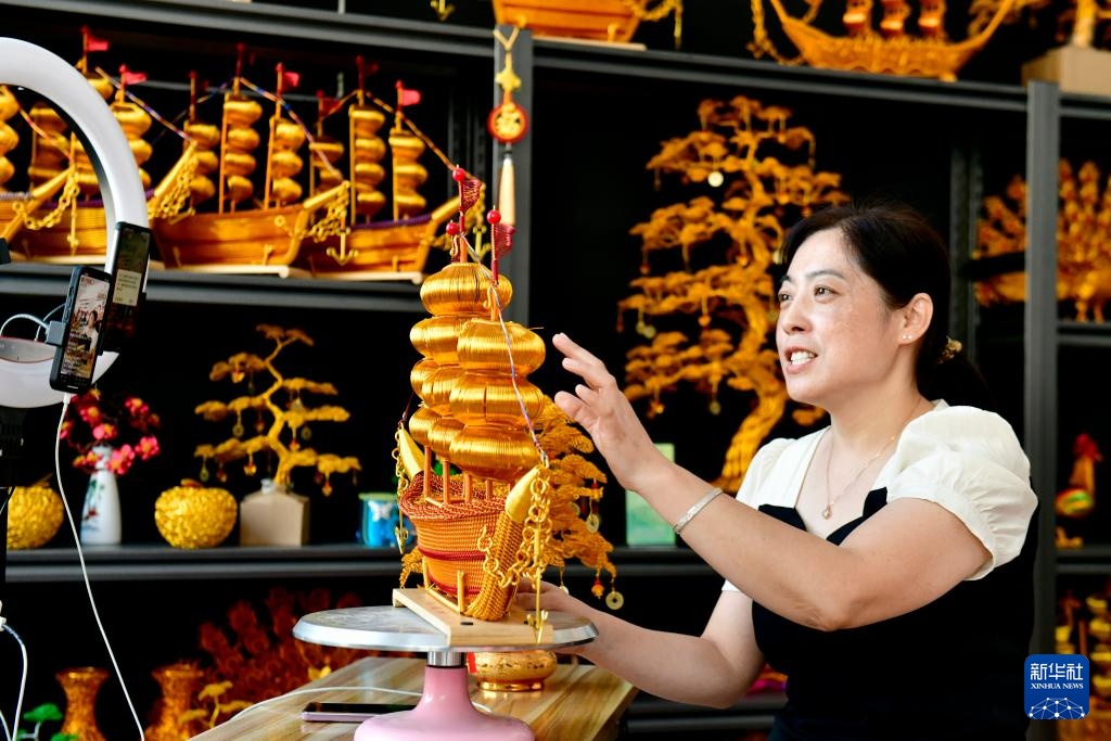 8月28日,在山东省滨州市惠民县辛店镇“如康家园”,工作人员康希芳直播销售残疾人加工的铝丝工艺品。