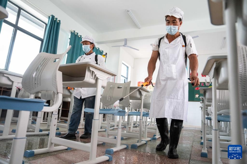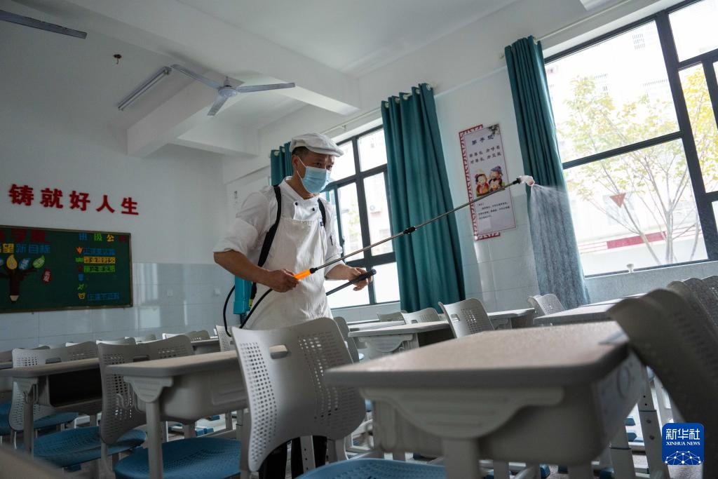 8月29日,在平江县启明中学,学校职工在教室进行消杀防疫作业。