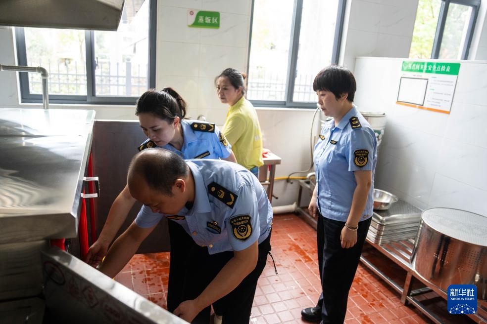 8月29日,在平江县启明中学,市场监督管理局工作人员对重装过的食堂进行食品卫生安全检查。