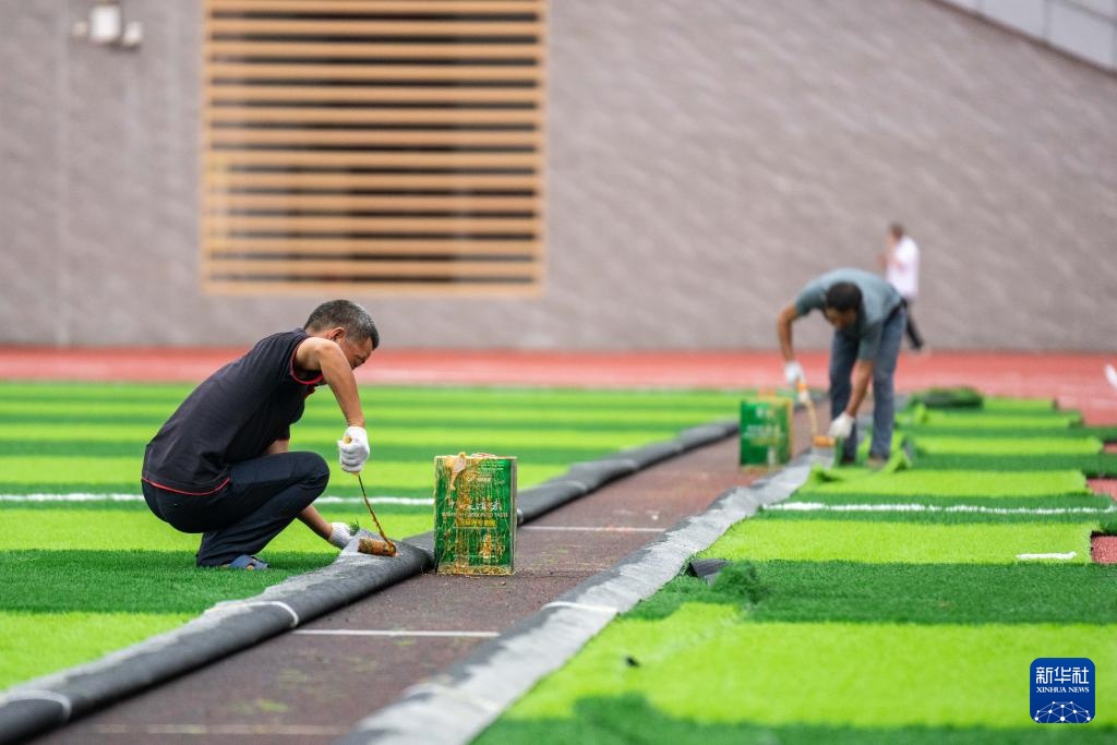 8月29日,在平江县桂花学校,施工人员对操场的人造草坪进行修复。