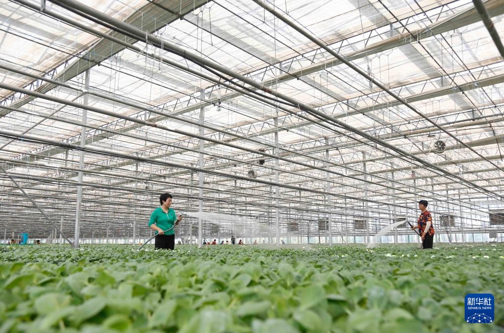 8月29日,在邢台市南和区贾宋镇一家育苗基地,工人为蔬菜秧苗浇水。
