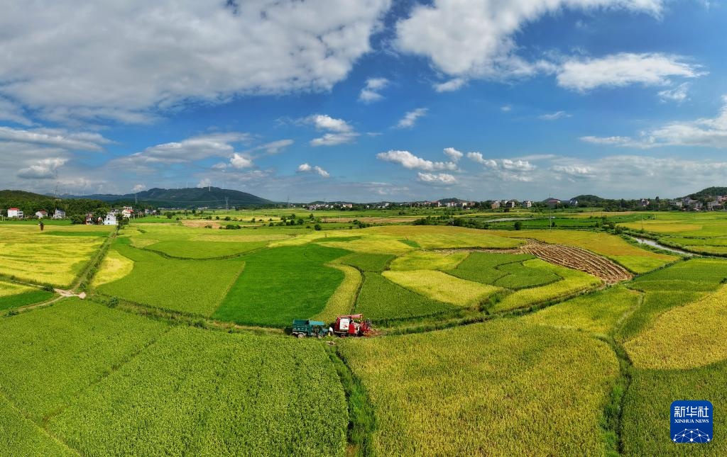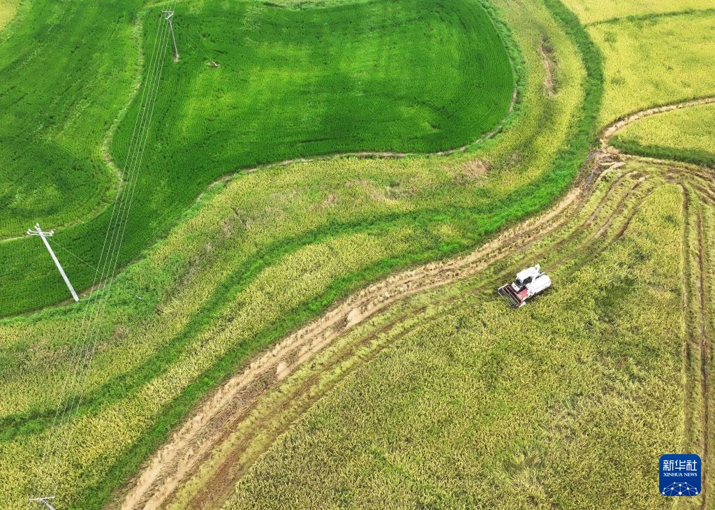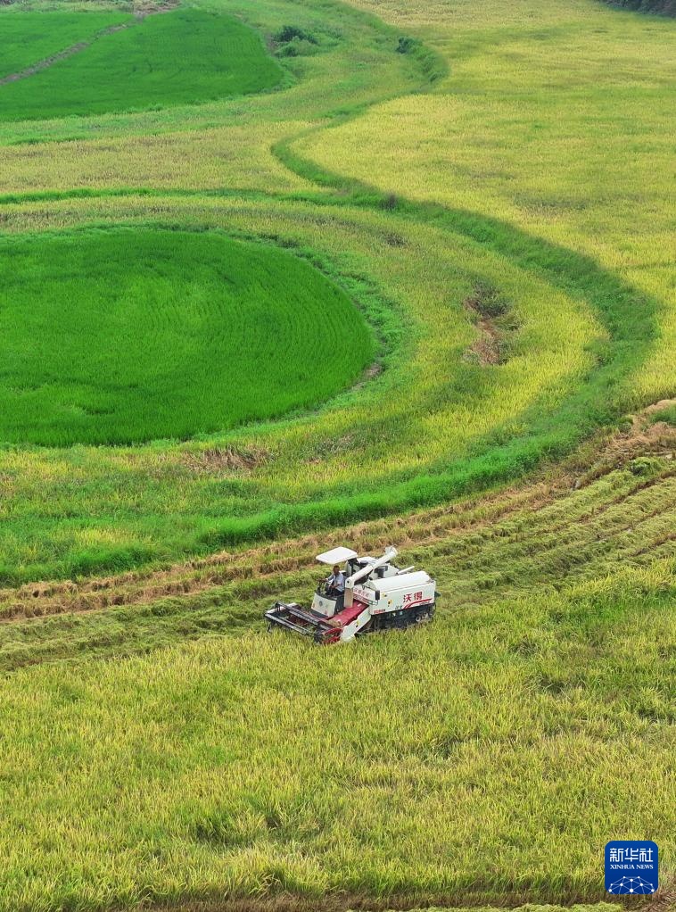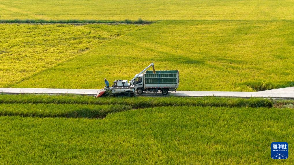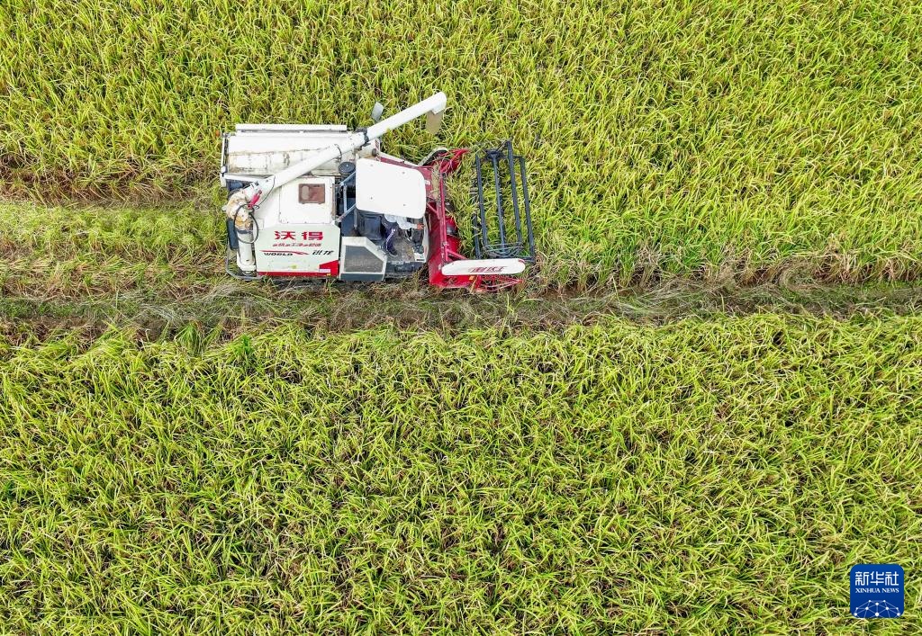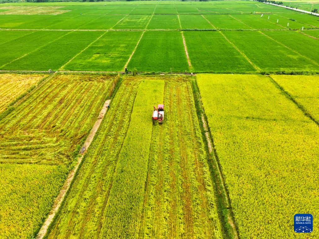 8月29日,在湖南省衡阳市衡山县长江镇,当地村民驾驶农机收割稻谷(无人机照片)。