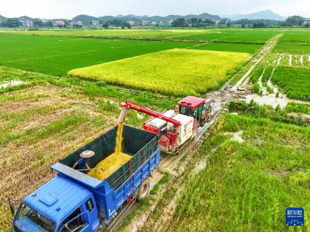 8月29日,湖南省常宁市洋泉镇杉树村村民将刚收获的稻谷卸到转运车上(无人机照片)。