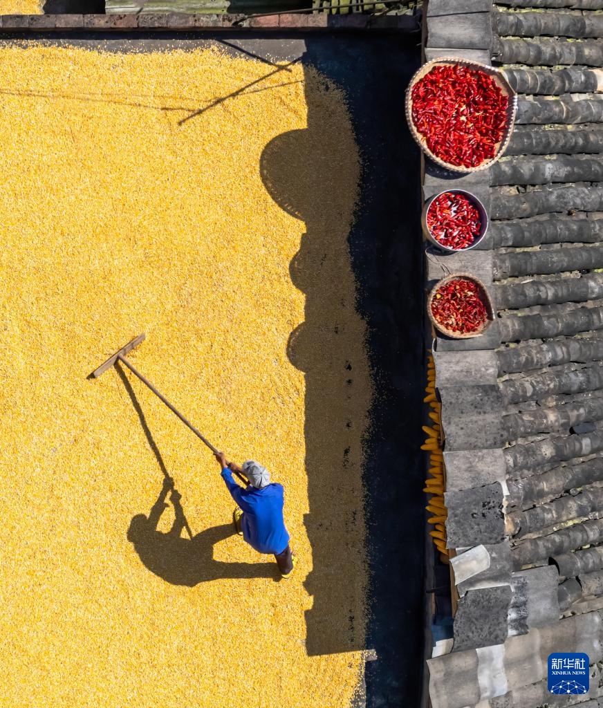 8月28日,云南省昭通市绥江县群众抢抓晴好天气晾晒稻谷、辣椒等农作物(无人机照片)。