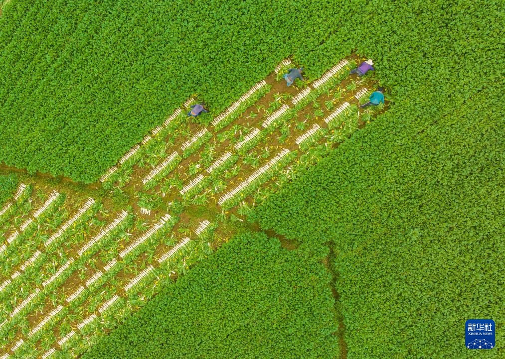 8月29日,湖北省宜昌市秭归县两河口镇云台荒村村民在田间采收萝卜(无人机照片)。