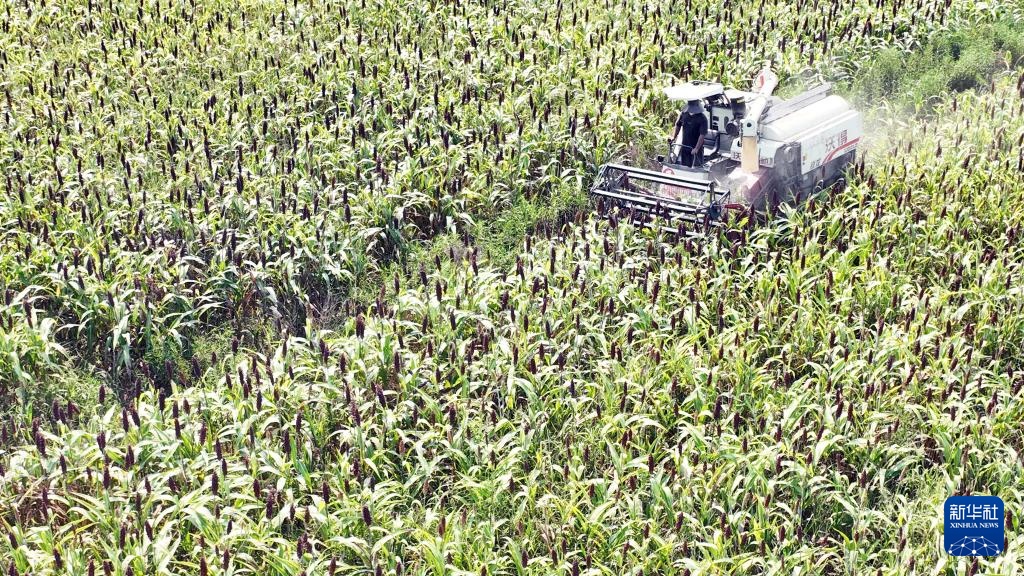 8月28日,在重庆市永川区青峰镇凌阁堂村红高粱基地,机耕手驾驶收割机收割高粱(无人机照片)。