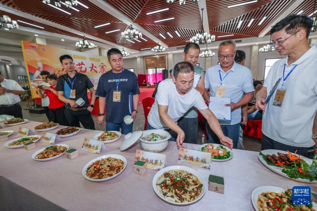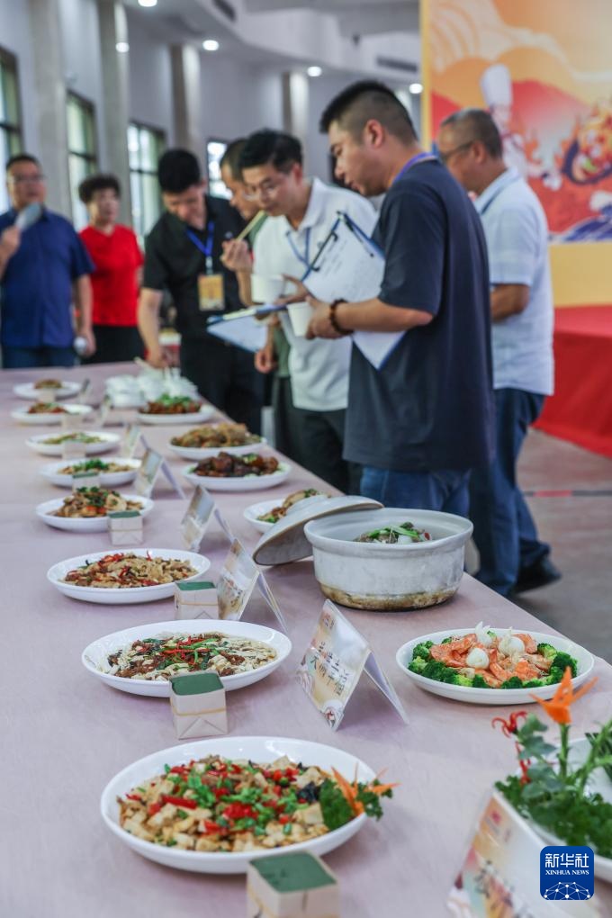 8月29日,专业评委在评审“幸福方桌”厨艺大赛的参赛厨师们烹饪的特色菜。