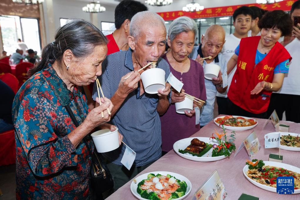 8月29日,乾潭镇幸福村的老人们在品尝“幸福方桌”厨艺大赛的参赛厨师们烹饪的特色菜。
