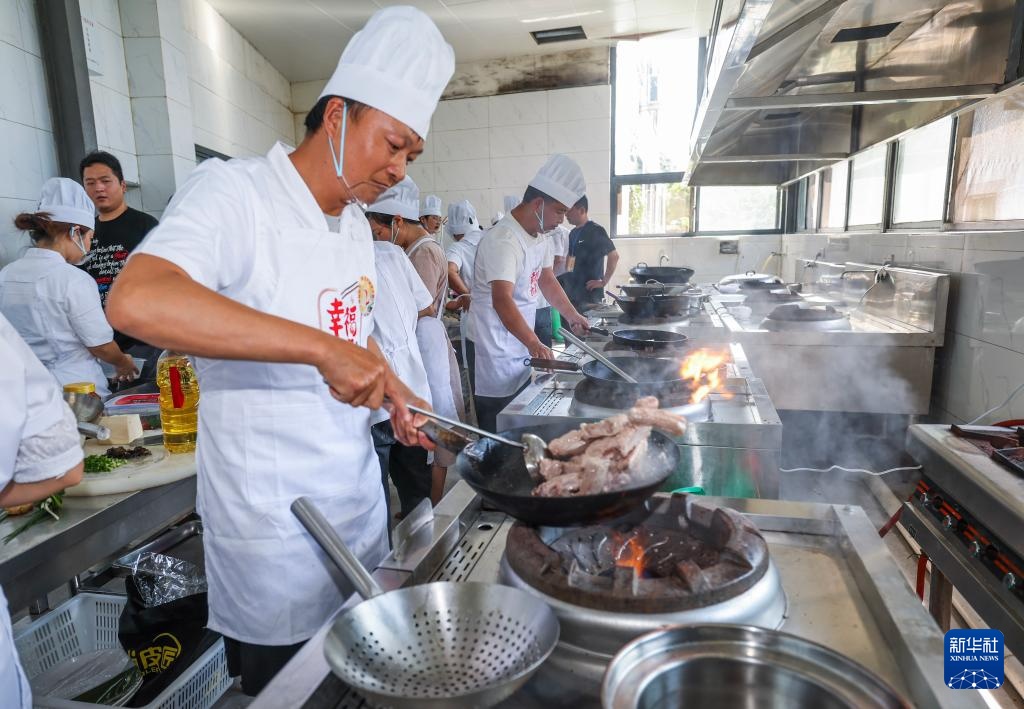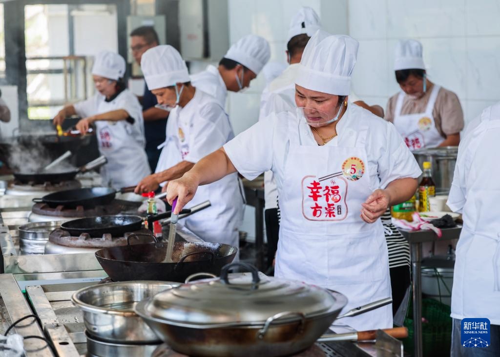 8月29日,参加“幸福方桌”厨艺大赛的乡镇老年食堂的厨师们在烹饪特色菜。